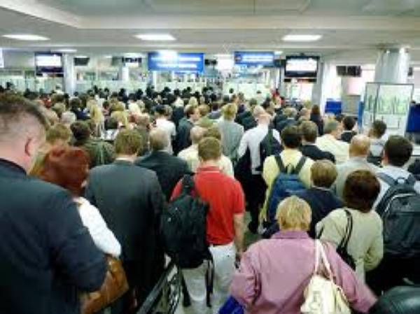 Och mycket riktigt. Redan när vi lämnar flygplanet blir vi uppmanade att bilda två köer: en kö för amerikanska medborgare och en för besökare. Det blir sammanlagt 12 köer, var och en cirka 30 meter lång framför 12 boxar, där de allsmäktiga kontrollerar våra pass.